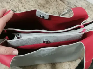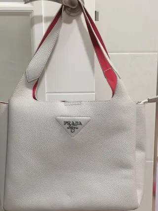 Borsa elegante del marchio Prada, con un design bicolore che combina bianco e rosa. Materiale in pelle testurizzata. Interno in contrasto di colore. Logo triangolare di Prada in metallo argentato.