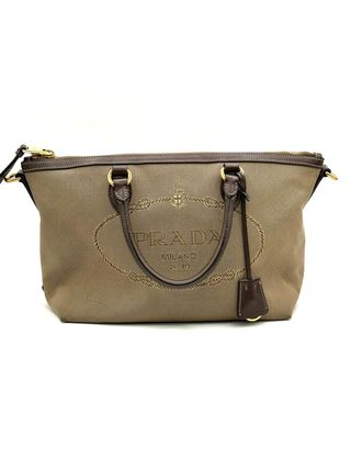 Tote Prada in tela beige e pelle marrone, elegante e pratica. Realizzata in tela di alta qualità con dettagli in pelle, hardware dorato e logo Prada Milano ricamato. Interno ampio rivestito in tessuto jacquard con logo. Dimensioni 34 × 20 × 14 cm. Include tracolla smontabile. Buono stato generale, lievi segni d'uso sulla tela.