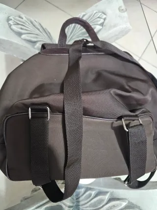Zaino in tessuto marrone con dettagli in pelle. - Logo triangolare Prada. - Tasche frontali con chiusura a fibbia. - Chiusura principale a patta con fibbia. - Manico superiore e spallacci regolabili.