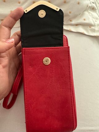 Elegante portafoglio e porta cellulare in colore rosso. Design triangolare con logo del marchio. Dettaglio metallico dorato sulla patta. Chiusura con cerniera laterale.