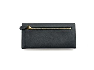 Portafoglio Prada in pelle Saffiano nera, con logo dorato Prada Milano. Dimensioni 19x9x1 cm. Design classico ed elegante con molteplici scomparti: fessure per carte, portamonete con cerniera e spazio per banconote. Chiusura a pressione. In ottime condizioni, con lievi segni d'uso. Ideale per chi cerca un pezzo di lusso funzionale e duraturo. Ref. 7973 - Barcellona