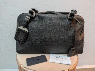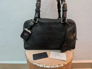 ⭐Borsa elegante Prada.⭐ - Design con logo Prada in rilievo all'interno. - Realizzata in pelle nera granulata. - Stile Bowling. - In buone condizioni, come si vede nelle foto. - Include due carte di autenticazione, lucchetto, chiavi e etichetta in pelle nera con placca metallica Prada. - Cerniera interna YKK, usata da marchi come Prada e Louis Vuitton, di qualità, silenziosa e morbida. ⭐Un fantastico regalo per queste feste⭐ - Piccolo difetto: minimo usura sulla cerniera esterna. ✴️Negoziabile✴️