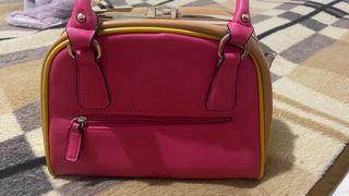Borsa a mano Prada elegante con un design accattivante. In perfetto stato, un solo difetto: una cerniera rotta, ma non influisce sull'uso. Colore principale fucsia vibrante. Dettagli in marrone. Logo metallico Prada sulla parte frontale.