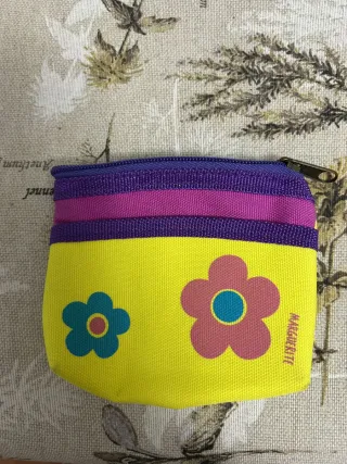 Portamonete con un allegro design floreale. - Chiusura con cerniera. - Due scomparti interni. - Dettaglio di due fiori decorativi nella parte frontale. - Nome del marchio visibile nella parte frontale.