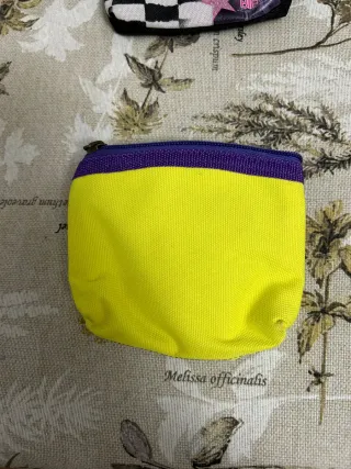 Set composto da tracolla e portafoglio abbinati. Design con il nome del marchio inciso. Adornato con un cuore bianco sulla tracolla. Colore giallo (più brillante rispetto alla foto). Il prezzo è negoziabile.