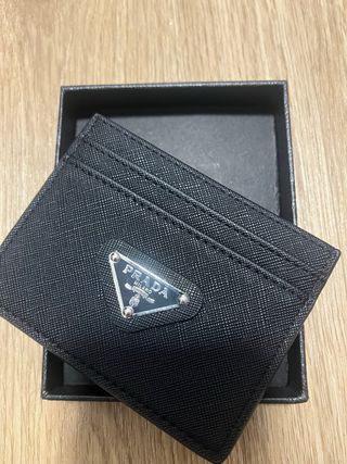 Elegante portacartellini del marchio Prada. Design classico e funzionale. Finitura testurizzata. Logo triangolare metallico distintivo.