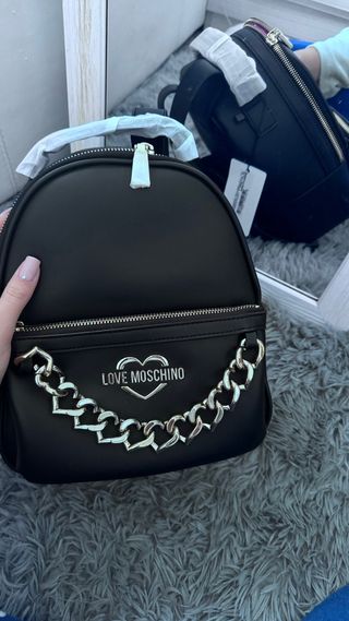 Zaino Love Moschino nero con dettagli a forma di cuore. - Logo LOVE MOSCHINO con cuore. - Catena frontale con maglie a forma di cuore. - Zip argentata. - Manico superiore. Vendo per inutilizzo, per qualsiasi altra informazione non esitate a contattarmi.
