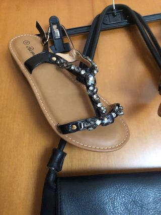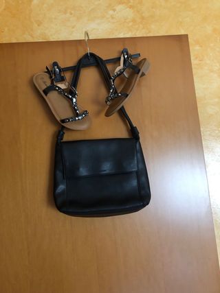 Set composto da una borsa e un paio di sandali NUOVI numero 38 - Borsa in ecopelle con chiusura a patta. - Sandali infradito con decorazioni strass. - Made in Italy.