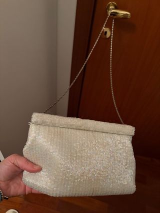 Elegante borsetta con una finitura scintillante e una catenella. - Decorata con perline. - Chiusura a scatto. - Catena metallica rimovibile.