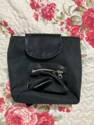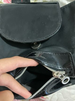 Zainetto nero con dettagli lucidi. - Tasca frontale con zip. - Chiusura superiore a patta.