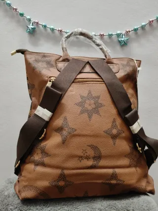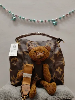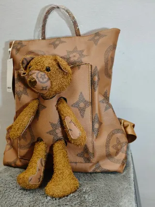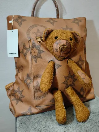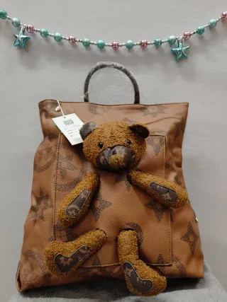 Borsa nuova con cartellino e nella sua confezione, molto comoda. Aperta esclusivamente per foto annuncio. Colorazione marrone scuro davanti e marrone chiaro dietro. La tracolla e il manico della borsa sono beige. Disponibile anche in modello zaino. Molto capiente, la borsa presenta tasca con zip dietro e sul davanti (dove è alloggiato il peluche). Internamente presenta due scomparti che sono a loro volta separati da un terzo scomparto chiuso a zip. Presenta anche una taschina interna sempre con zip e due tasche aperte. Misure: 30cm di altezza, 40 cm di larghezza e 15cm di spessore. #vinteditalia #borsa #zainetto #jean