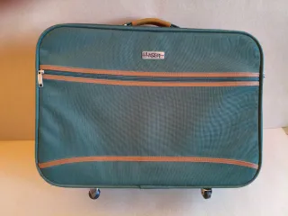 Valigia da viaggio del marchio Laser. - Colore verde con finiture marroni. - Manico superiore in pelle. - Zip frontale. - Ruote per un facile trasporto.