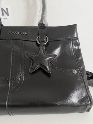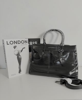 Elegante borsa nera lucida, perfetta per ogni occasione. Dotata di manici e tracolla regolabile per una maggiore versatilità. - Finitura lucida effetto pelle. - Dettaglio a forma di stella. - Chiusura con zip. - Logo del marchio visibile.