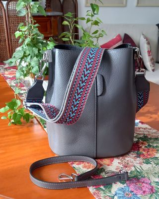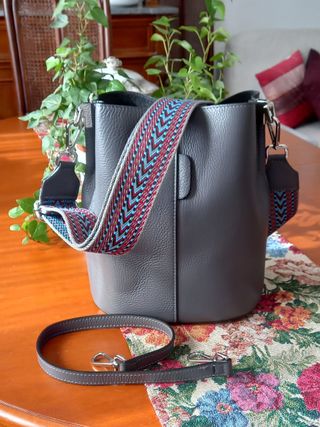 Elegante borsa a secchiello in vera pelle grigia, perfetta per ogni occasione. Dotata di una tracolla colorata e una più corta in pelle. Tasca interna centrale, dettagli in metallo argentato misure larghezza 23cm. altezza 27cm. circa #borsa #borsetta #pochette #sac #bag #handbag #bolsa #cuir #sacencuir #leatherbag #genuineleather #bolsadecuero #verapelle #borsapelle #borsasecchiello