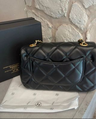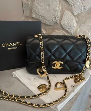 Elegante borsa a tracolla Chanel in pelle nera, impreziosita da dettagli dorati. - Design trapuntato iconico. - Catena a tracolla con maglie intrecciate in pelle. - Charm a forma di cuore dorati pendenti. compresa di scatola e cartellino per i membri