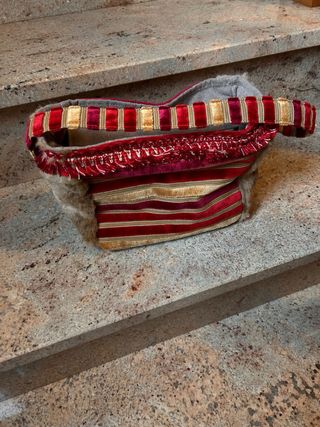Borsa artigianale in velluto, un pezzo unico. - Decorata con nastri in velluto e dettagli dorati. - Rifiniture con frange rosse. - Fodera interna in tessuto grigio. Dimensioni: Larghezza 27 cm Altezza 20 cm
