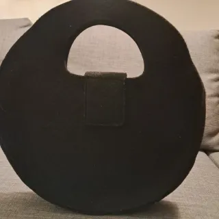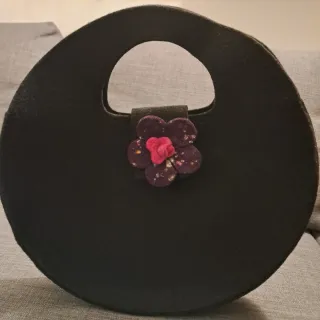 Bellissima borsa rotonda in feltro nero, decorata con un grazioso fiore applicato. - Materiale: feltro. - Colore del fiore: viola con dettagli colorati - Legerissima - Dettaglio centrale del fiore: rosso. - Artigianale