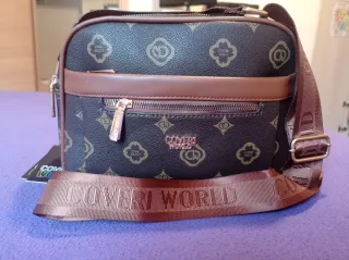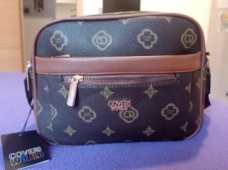 Borsa a tracolla con un elegante motivo monogramma. - Tracolla regolabile. - Tasca esterna con zip. - Dettagli in ecopelle marrone. - Logo Coveri World in rilievo.