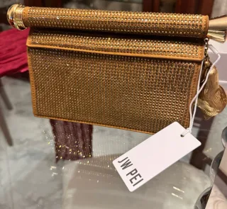 Elegante pochette JW PEI color oro, perfetta per completare il tuo look. - Dettagli scintillanti. - Chiusura a rullo con barra metallica. - Tassel decorativo dorato.