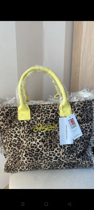 Borsa con stampa leopardata e manici gialli. - Dettagli con frange. - Logo ricamato.