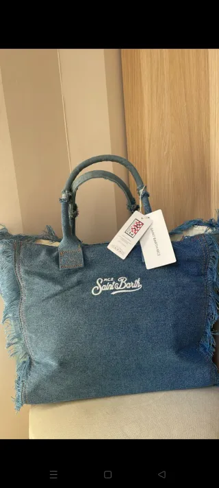 Borsa in denim MC2 Saint Barth, perfetta per l'estate. Presenta un design alla moda con frange e scritte. - Materiale: Denim - Colore: Blu - Dettagli: Frange decorative, scritte The place to be Saint Barth Summer Paradise