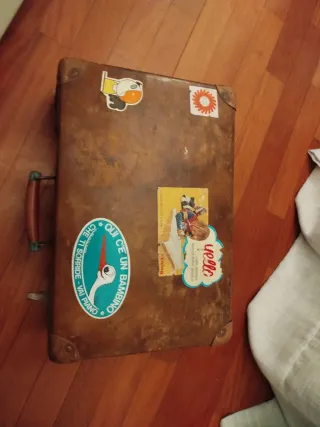 Valigia vintage in cartone, perfetta per un tocco retrò. - Manico in pelle. - Dettagli metallici. - Decorata con adesivi originali.