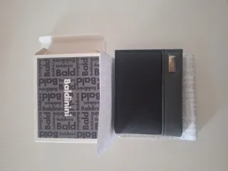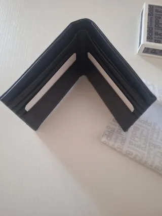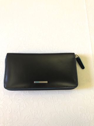 Portafoglio in pelle nera con logo. - Logo metallico applicato sul fronte. - Design classico ed elegante.