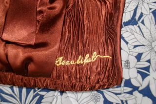 In raso increspato, chiusura a zip . Colore ruggine - Fodera interna colore nero - Ricamo Beautiful dorato.