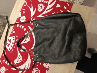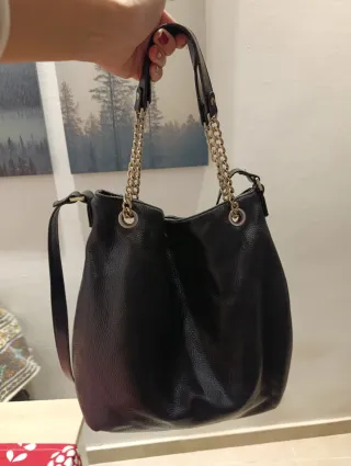 Borsa a spalla in pelle nera, con dettagli a catena dorata. - Materiale: vera pelle. - Manici in pelle con inserti a catena. - Chiusura superiore. -usata ma in buone condizioni, manca la catenella esterna con il logo metallico.