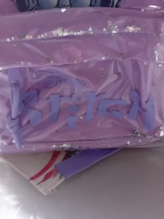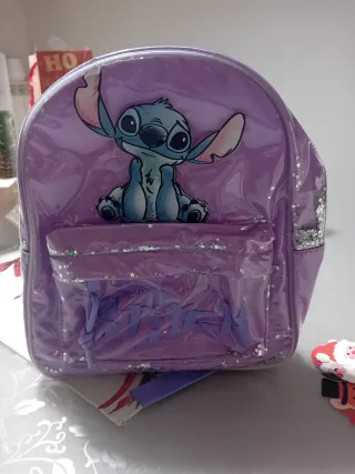 Zainetto per bambina con personaggio Stitch. - Design trasparente con glitter. - Applicazione di Stitch sul davanti. - Chiusura con zip.