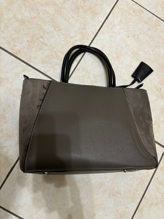 Elegante borsa a mano con un design moderno. - Materiale in similpelle testurizzata. - Dettagli in camoscio sui lati. - Manici neri lucidi. - Charm in pelle nera attaccato.