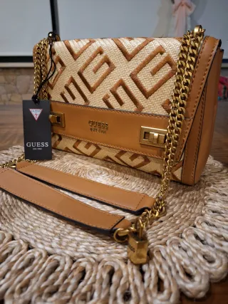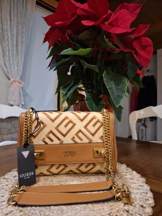 Elegante borsa Guess con un design unico e molto raffinato ❤️🏷💃 😍 - Dettagli in pelle e raffia color cuoio e beige - Tracolla a catena dorata - Chiusura a scatto. - Piccolo lucchetto decorativo con logo Guess❤️ Nuova con etichetta 🏷 Nessun difetto ❤️ Ideale come idea regalo 🎁 Lunga 28cm Alta 18cm Profonda 8cm Prezzo listino 140€ 🏷
