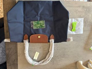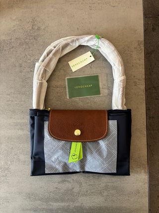 Borsa Longchamp Le Pliage, taglia L, colore blu con dettagli marroni. - Manici in pelle marrone. - Chiusura con bottone a pressione e zip. - Tasca interna. - Logo Longchamp impresso sulla patta.