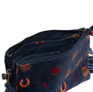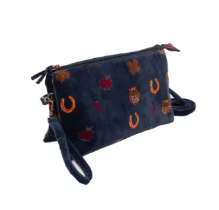 Pochette in velluto blu con fantasia portafortuna - Fantasia con coccinelle, gufi, ferri di cavallo e peperoncini. - Materiale: velluto. - Colore: blu con dettagli multicolor.
