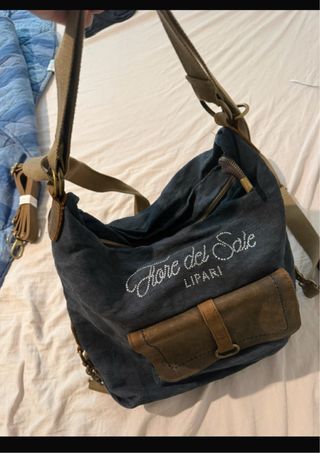 Zaino in denim con dettagli in pelle marrone. - Materiale principale: denim - Dettagli: pelle - Scritta Fiore del Sole LIPARI decorata con strass