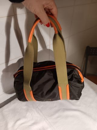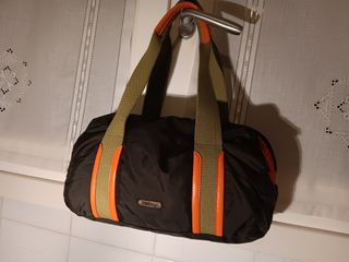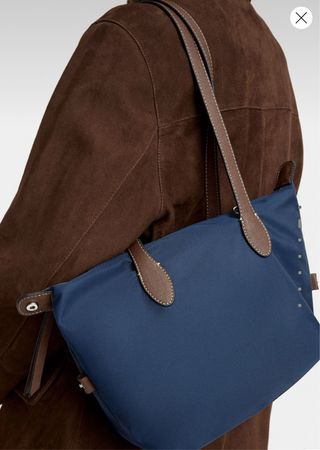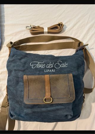Borsa in tessuto blu impermeabile con dettagli in pelle marrone. - Tracolla interna da poter utilizzare - Chiusura con zip. - Tasca interna. - Finiture in metallo argentato.
