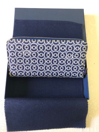 Elegante portafoglio Marinella con una fantasia di cerchi concentrici nei toni del blu e del bianco. Realizzato con cura per un tocco di stile. - Fantasia geometrica con cerchi. - Zip di chiusura. - Dettagli in pelle.
