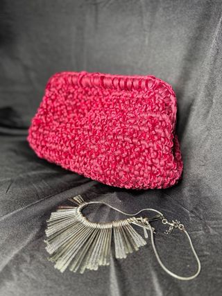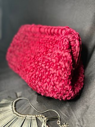 Elegante pochette in tessuto di un vivace color rosso. La sua texture la rende unica e adatta a diverse occasioni. - Materiale: Tessuto e velluto - Colore: Rosso - Design: Pochette