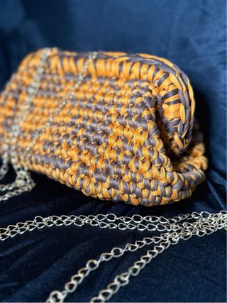 Clutch bicolore con un design intrecciato. - Realizzato in filato. - Manico integrato da 20cm.