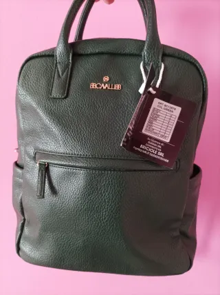 Zaino nuovo del brand Bcavallisb, colore verde. - Modello: BC1357# - Materiale: similpelle martellata - Tasca frontale con zip - Tasche laterali aperte - Logo dorato sul davanti - Dettagli in metallo dorato