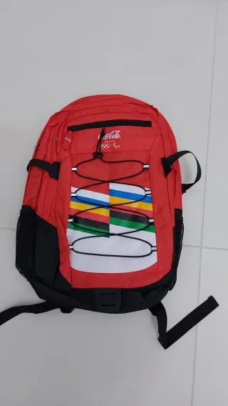 Zaino Coca-Cola a tema Olimpiadi Invernali. - Colore rosso vivace. - Design con cordini elastici neri. - Logo Coca-Cola e simboli olimpici presenti.