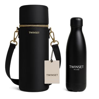 Elegante borsa porta bottiglia termica Twinset. - Materiale nero. - Tracolla regolabile con moschettoni dorati. - Chiusura superiore a zip dorata. - Targhetta logo Twinset inclusa.