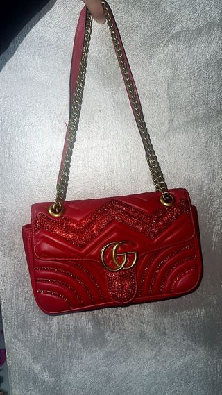 Borsa a tracolla Gucci in pelle rossa con dettagli glitterati e logo GG dorato. La tracolla è una catena dorata. - Design trapuntato a chevron. - Dettagli scintillanti. - Chiusura con patta. - Logo GG iconico.