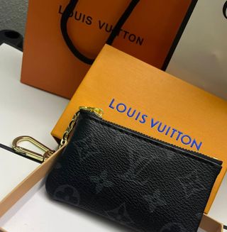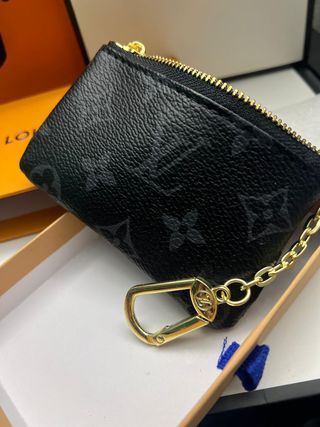 Elegante portamonete Louis Vuitton in pelle nera, con dettagli dorati. - Motivo monogram LV inciso. - Zip di chiusura. - Dettaglio catenella con moschettone dorato.