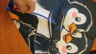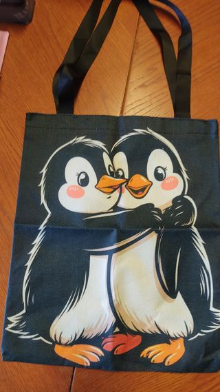 Shopper con un adorabile disegno di due pinguini che si abbracciano. - Design unico con pinguini. - Manici neri. - Colore principale nero con dettagli arancioni.