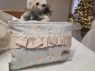 Pochette artigianale in stile Shabby Chic, realizzata interamente a mano con cura e attenzione ai dettagli. - Tessuto principale con fantasia floreale azzurra. - Dettaglio con passamaneria e pieghe in tessuto a quadretti. - Chiusura con cerniera.
