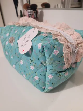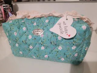 Pochette Shabby Chic realizzata a mano con un delizioso motivo floreale su sfondo turchese. La rifinitura superiore in pizzo rosa aggiunge un tocco romantico. - Motivo floreale su tessuto trapuntato. - Dettaglio in pizzo rosa. - Etichetta handmade applicata. - Cartellino a forma di cuore con scritta mit liebe gemacht (fatto con amore).