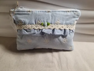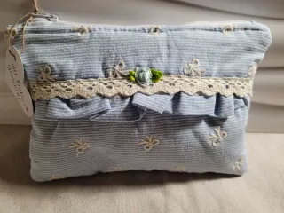 Pochette in stile Shabby Chic, perfetta per aggiungere un tocco di eleganza. - Tessuto a righe azzurre e dettagli beige. - Decorata con pizzo e un piccolo fiore. - Chiusura con cerniera.