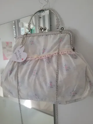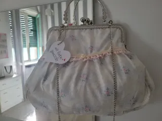 Elegante borsa stile shabby chic con chiusura a clic clac. - Tessuto con fantasia floreale. - Dettagli in pizzo rosa. - Manico rigido e tracolla a catena. - Decorazione floreale applicata.