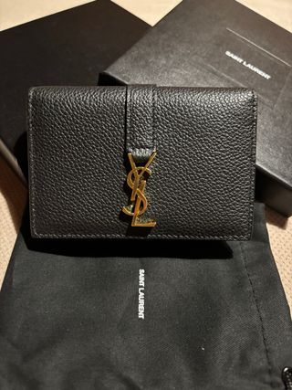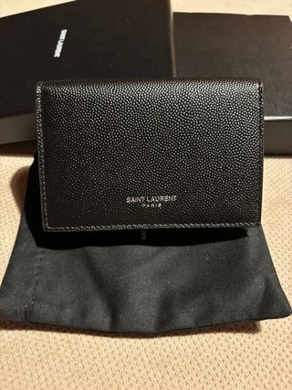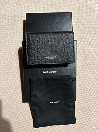 Elegante portacarte Saint Laurent. - Logo YSL dorato. - Pelle martellata. - Chiusura con bottone a pressione.